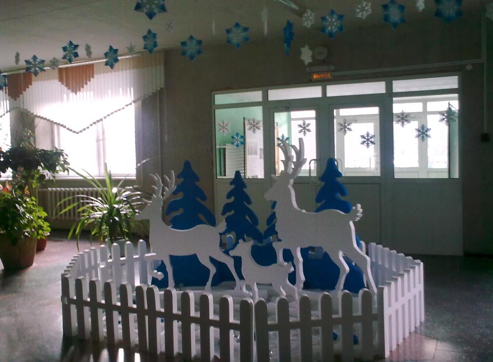 В коридорах обычно оформляют стены, окна и потолок, потому что декорации не должны мешать проходу учеников в классы. Можно устроить обилие снежинок под потолком и бумажные украшения окон.