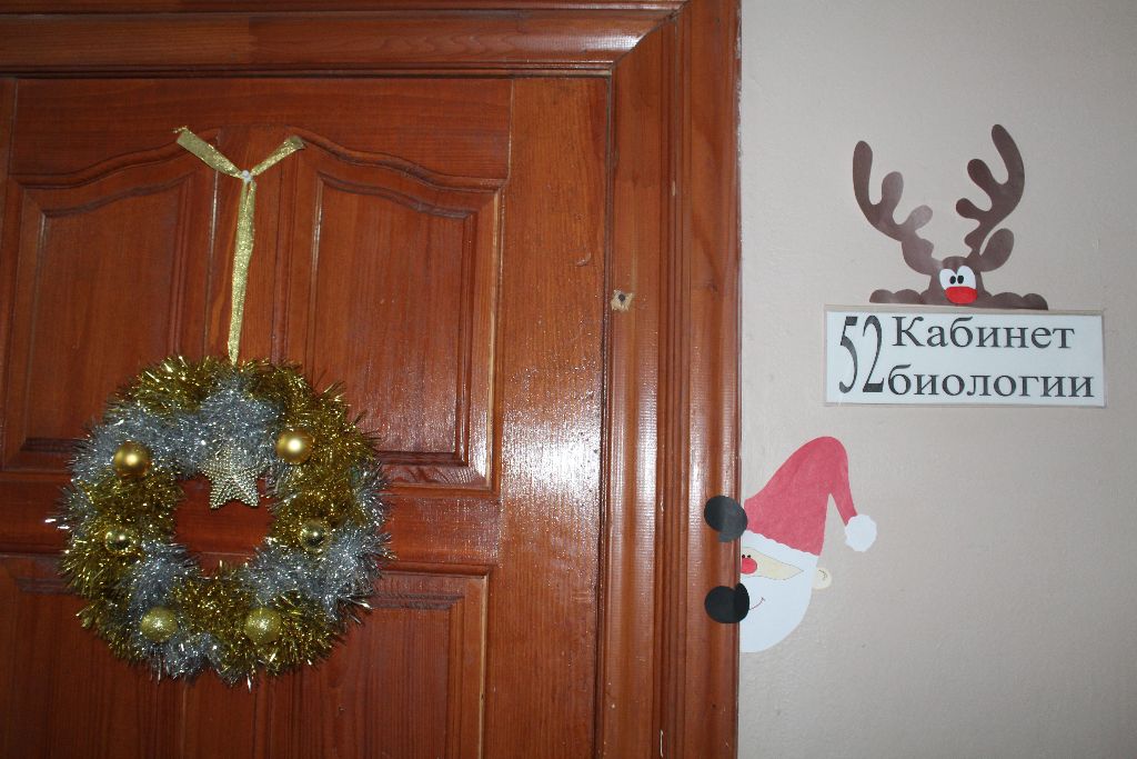 Главный вход или дверь в кабинет декорируют поделками в виде рождественского венка или новогодней ёлки.