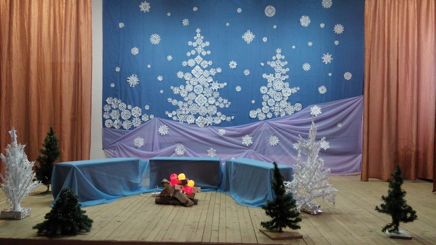 Скоро Новый Год. Все готовятся заранее к этому празднику. И наша школа, конечно же, не исключение. Моя почетная обязанность заключается в оформлении актового зала к новогодним утренникам. Вначале декабря я и учитель изобразительного искусства Лилия Александровна «ломаем» голову над вопросом «Как же украсить зал в этом году?» Долго думали –гадали и решились на такое трудоёмкое оформление.