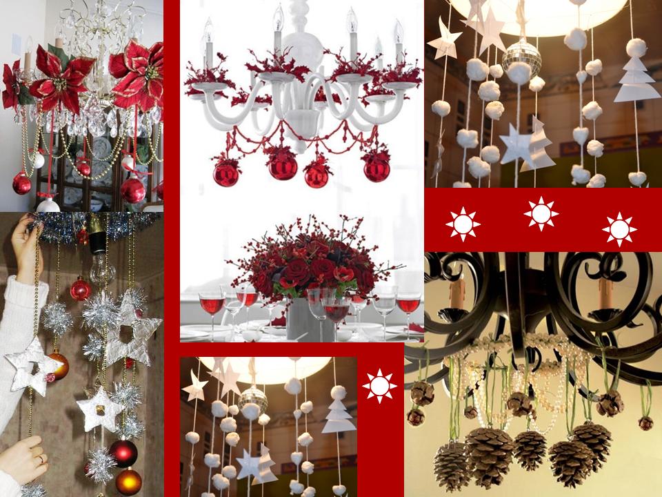Также можно украсить потолок помещения, развесив рядом с люстрой красивые подвески из елочных шаров, стилизованные подсвечники из фигурных стеклянных банок и елочные венки. Красиво на большой люстре, висящей над праздничным столом, будут смотреться подвески из ажурных снежинок.