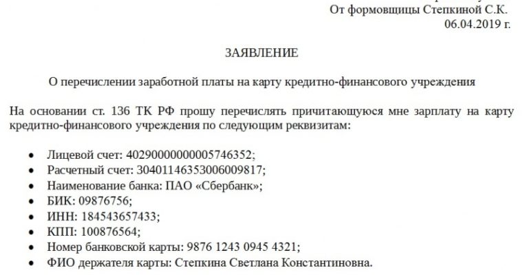 Заявление на перечисление зарплаты на банковскую карту: для чего пишется, как правильно его написать Привлекая сотрудников для выполнения определенных трудовых функций на предприятии, организация или ИП должны своевременно выплачивать им предусмотренное заключенным соглашением вознаграждение. При этом работающие в компании могут выбрать, каким именно способом осуществлять им такие выплаты — наличкой или на карту. В последнем…