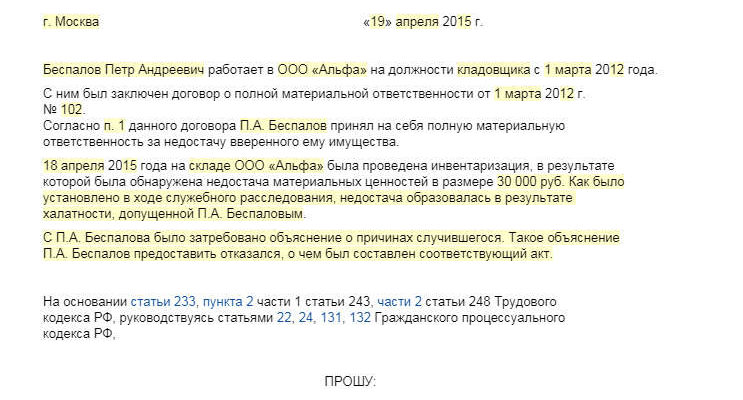 Взыскание материального ущерба с работника – уволенного, порядок, сроки, способы Когда в штат берется новый сотрудник, то он четко должен понимать меру ответственности за испорченное (утраченное) имущество, принадлежащее на правах собственности работодателю. Для законного назначения компенсации или части компенсации за потери, убытки владельца финансовых активов или объекта основных средств не нужно даже заключать договор о … Читать далее Взыскание материального ущерба с работника. порядок, срок давности