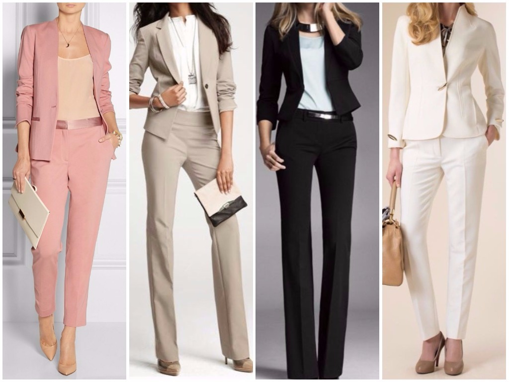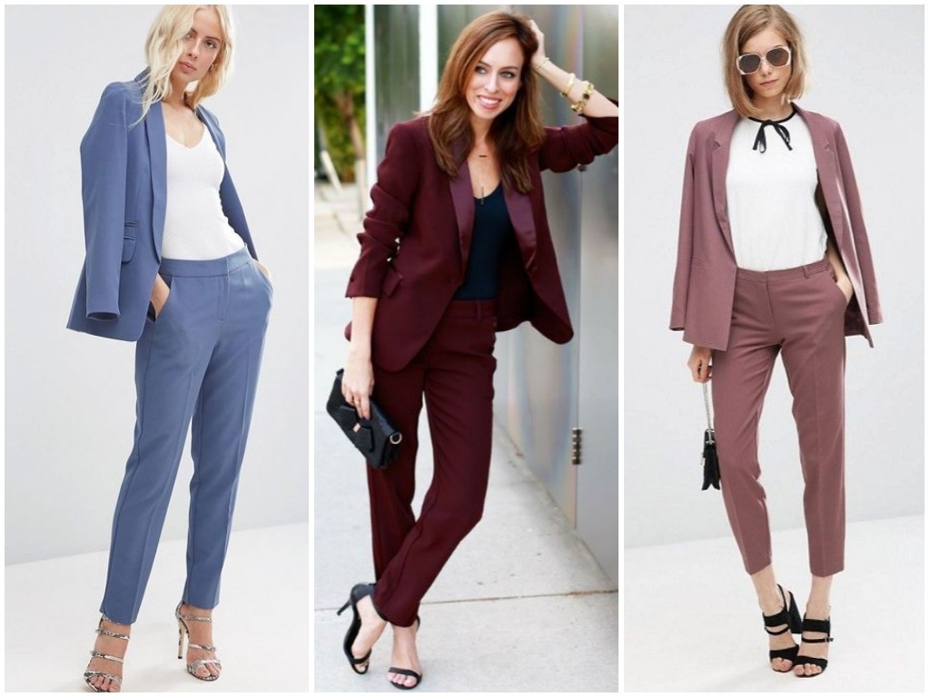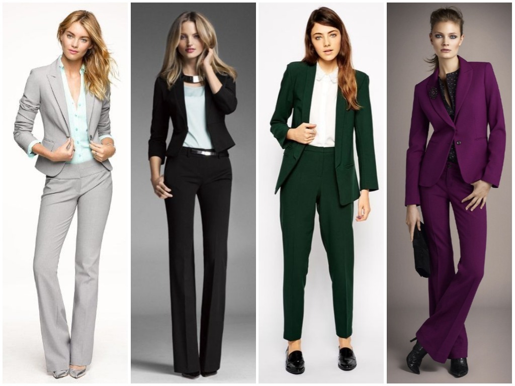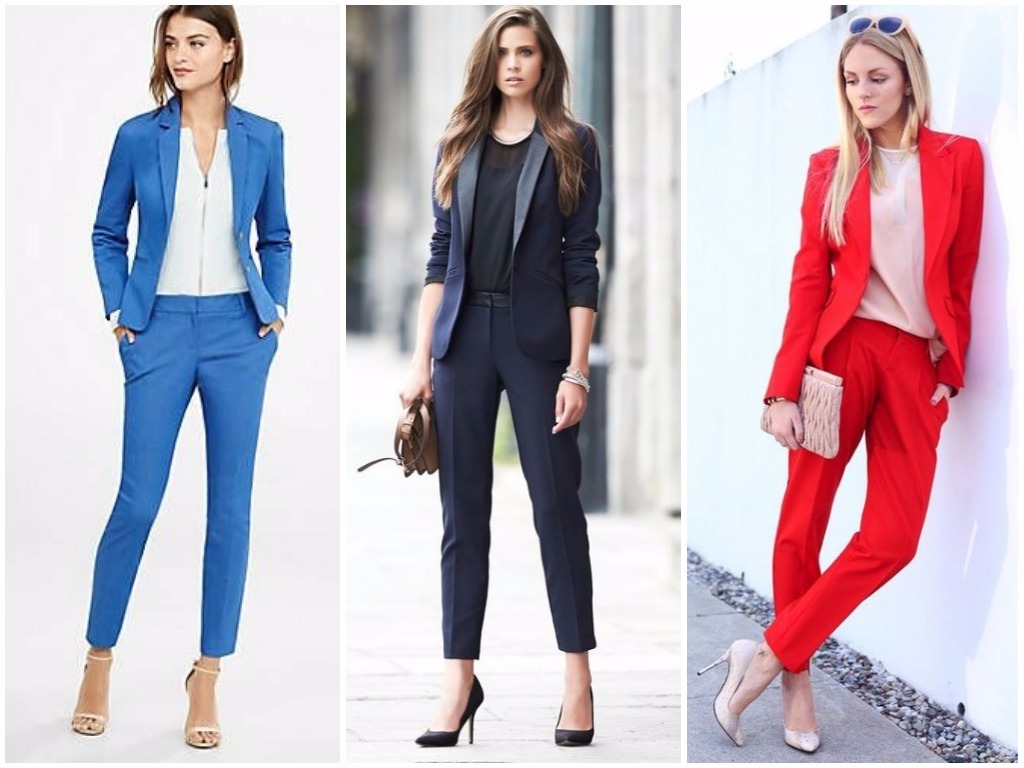 • брюки-стрелки – в брючном костюме делового стиля особенно уместно использовать штаны с наглаженными стрелками, пиджак в этом случае выбирается строгого слегка угловатого покроя, что придаёт ему серьёзности и невозмутимости; разумно использовать модные сегодня тёмно-синие оттенки, светло-серые и цвет беж;• удлинённый жилет плюс укороченные брюки – очень неординарным вариантом считается яркая стилистика в виде брюк длиной по уровень щиколотки и удлинённой безрукавки; такая современная классика смотрится идеально под белую рубашку или блузу, особенно если выполнена из ярких тканевых оттенков типа алого, цвета электрик, глубокий изумруд и тому подобных;• классический клёш – в моду снова возвращаются расклешённые брюки; в деловой классической стилистике женские штаны не должны быть слишком уж расширены книзу: это может быть слегка расклешённый покрой от колена или от бедра. Гармонично выглядит такой пошив костюма в пастельных тонах: небесно-голубом, бледно-розовом, кремовом, белом;• брючная классика с атласной отделкой – невероятно красивые костюмы предлагают сейчас женщинам представительства фешн-индустрии, бутики, магазины модной классической женской одежды в виде чёрных костюмов с атласной каймой. Укороченные зауженные книзу брюки с подворотом из атласной ленты, с косыми карманами, пошитыми от атласного пояса и с жакетом, отделанным атласной каймой, выглядят невероятно стильно и эффектно. Очень уместно дополнить данный образ чёрно-белой рубашкой в вертикальную тонкую полоску – женщина в таком костюме ни в коем случае не останется незамеченной, ведь смотрится он просто потрясающе;• играющая цветами классика – не всегда костюм отождествляется с однотоном. В грядущем сезоне модно будет сочетать верх одной цветовой тональности с низом другого оттенка. Очень яркое и всегда впечатляющее сочетание – белый с красным: белоснежные брюки с ярким алым пиджаком будут выглядеть неординарно и, в то же время, элегантно. Также допустима классике завсегдатая игра чёрного с белым: уместно на чёрном пиджаке иметь фурнитуру белого цвета в тон брюкам.