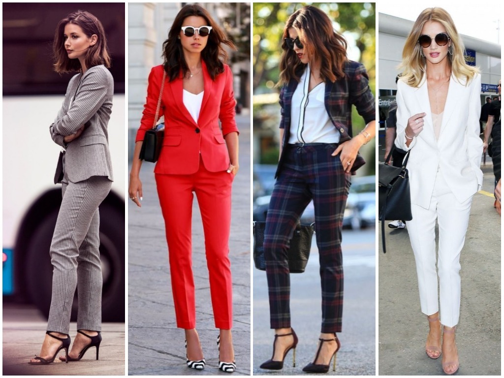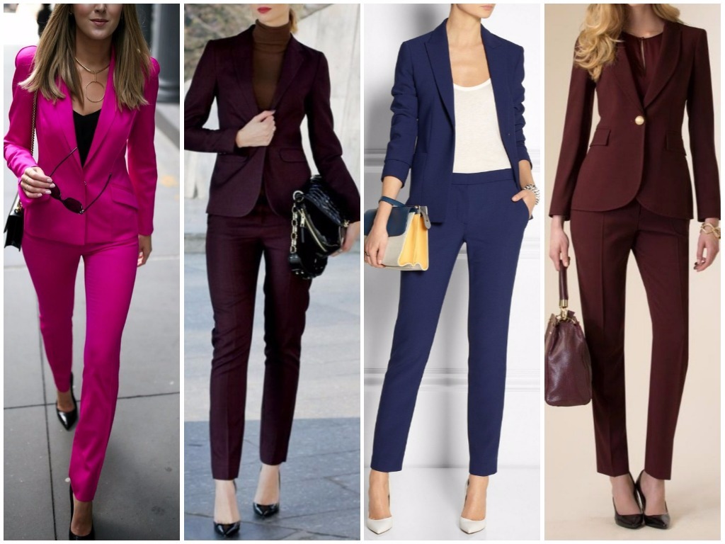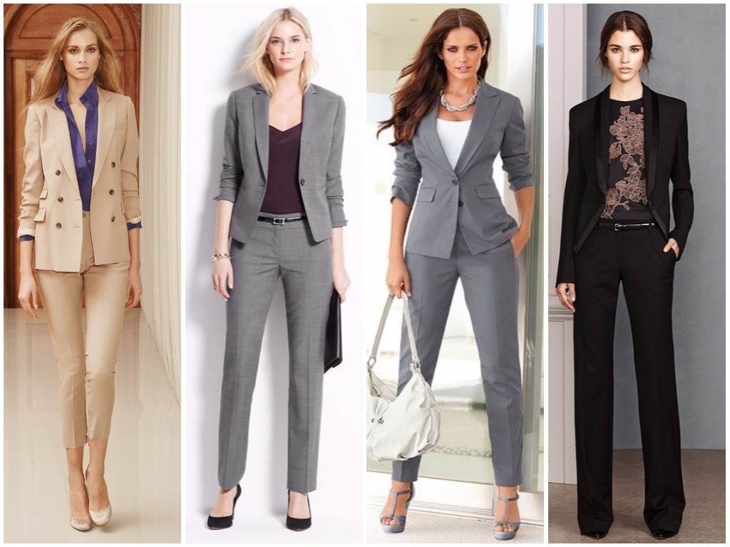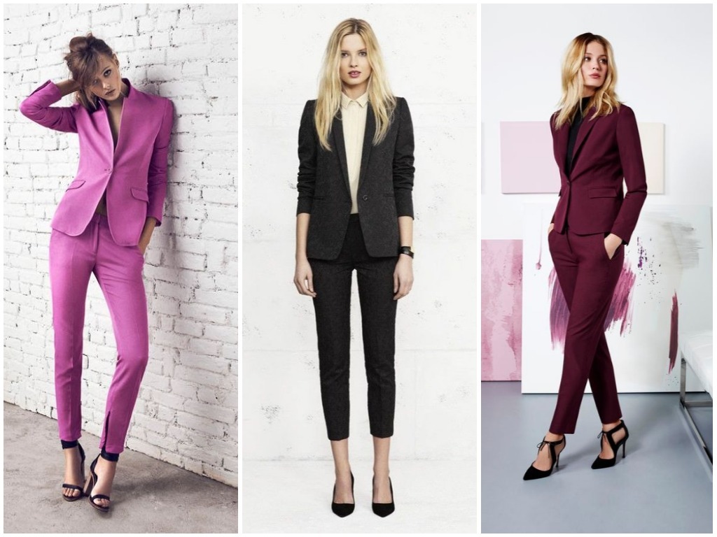 • брюки-стрелки – в брючном костюме делового стиля особенно уместно использовать штаны с наглаженными стрелками, пиджак в этом случае выбирается строгого слегка угловатого покроя, что придаёт ему серьёзности и невозмутимости; разумно использовать модные сегодня тёмно-синие оттенки, светло-серые и цвет беж;• удлинённый жилет плюс укороченные брюки – очень неординарным вариантом считается яркая стилистика в виде брюк длиной по уровень щиколотки и удлинённой безрукавки; такая современная классика смотрится идеально под белую рубашку или блузу, особенно если выполнена из ярких тканевых оттенков типа алого, цвета электрик, глубокий изумруд и тому подобных;• классический клёш – в моду снова возвращаются расклешённые брюки; в деловой классической стилистике женские штаны не должны быть слишком уж расширены книзу: это может быть слегка расклешённый покрой от колена или от бедра. Гармонично выглядит такой пошив костюма в пастельных тонах: небесно-голубом, бледно-розовом, кремовом, белом;• брючная классика с атласной отделкой – невероятно красивые костюмы предлагают сейчас женщинам представительства фешн-индустрии, бутики, магазины модной классической женской одежды в виде чёрных костюмов с атласной каймой. Укороченные зауженные книзу брюки с подворотом из атласной ленты, с косыми карманами, пошитыми от атласного пояса и с жакетом, отделанным атласной каймой, выглядят невероятно стильно и эффектно. Очень уместно дополнить данный образ чёрно-белой рубашкой в вертикальную тонкую полоску – женщина в таком костюме ни в коем случае не останется незамеченной, ведь смотрится он просто потрясающе;• играющая цветами классика – не всегда костюм отождествляется с однотоном. В грядущем сезоне модно будет сочетать верх одной цветовой тональности с низом другого оттенка. Очень яркое и всегда впечатляющее сочетание – белый с красным: белоснежные брюки с ярким алым пиджаком будут выглядеть неординарно и, в то же время, элегантно. Также допустима классике завсегдатая игра чёрного с белым: уместно на чёрном пиджаке иметь фурнитуру белого цвета в тон брюкам.