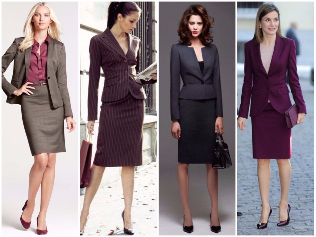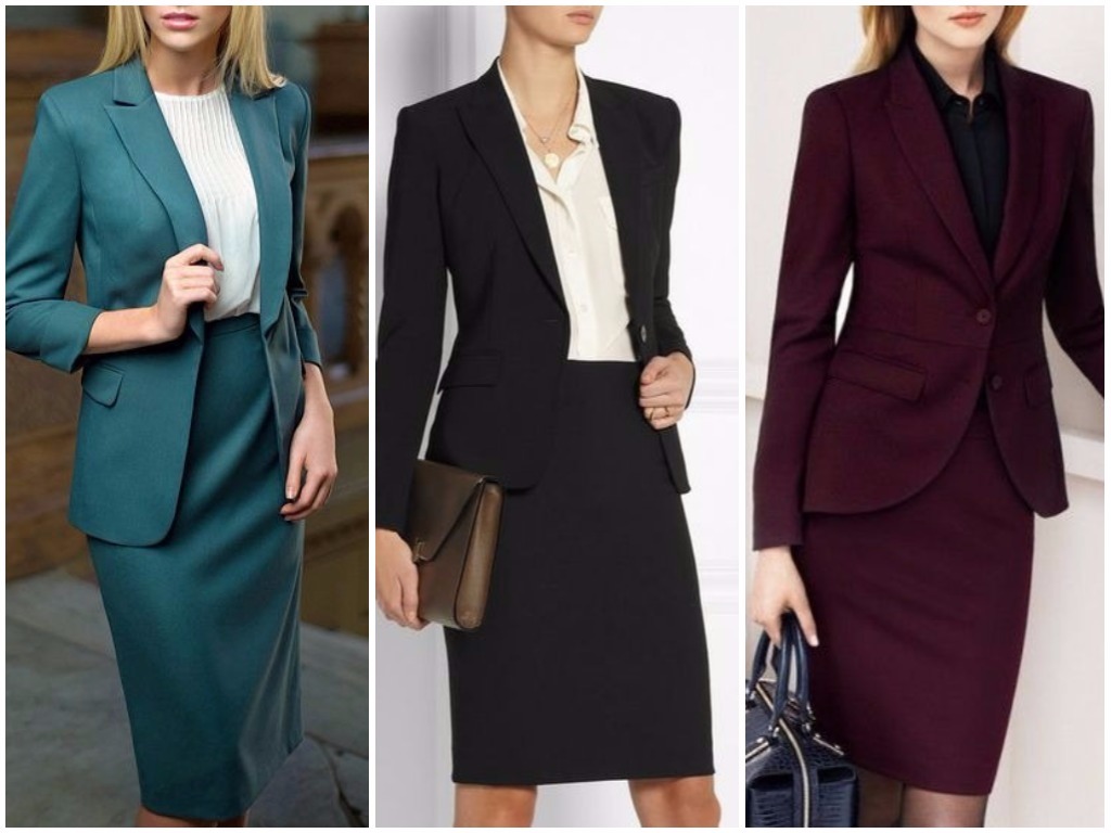 • приталенный пиджак и юбка-карандаш – очень давно пользуется спросом данная комбинация среди бизнес-леди и представительниц делового стиля; юбка-карандаш в новомодном цвете ультрамарин или ещё более современном тоне марсала в комплектации с подчёркивающим тонкую талию жакетом той же тональности выглядит очень эффектно и элегантно;• классическое миди – слегка зауженная юбка по колено с завышенной талией великолепно сочетается с укороченным прямым пиджаком с рукавом в три четверти. Особенно выгодно такой классический комплект смотрится на девушках с узкой талией и слегка широковатыми бёдрами – современный крой юбки и короткая длина пиджака позволяют подчеркнуть женственность и изящность фигуры обладательницы этого костюма;• классический юбочный костюм с баской – тренд современности, очень модное новшество последних сезонов; баска позволяет скрыть мелкие изъяны фигуры и очень изящно оттеняет грань узкой талии. Классический стиль костюма с баской предполагает сочетание чёрно-белой цветовой гаммы, низ и верх при этом можно варьировать, а в качестве акцента подобрать тонкий золотистый модный поясок;• костюм в стиле классика-модерн – ещё один достаточно неординарный вариант, предполагающий удлинённую по уровень щиколотки прямую юбку и жилетку пиджачного безрукавного стиля; расцветка должна быть выдержанных тёмных тонов – чёрный, иссиня-чёрный, графитовый, серый. Разбавить серость окраски подобного наряда можно надетой под низ жилетки тонко кофтой бело-чёрной расцветки в горизонтальную полоску – это оживит классический образ и придаст ему модной тональности.