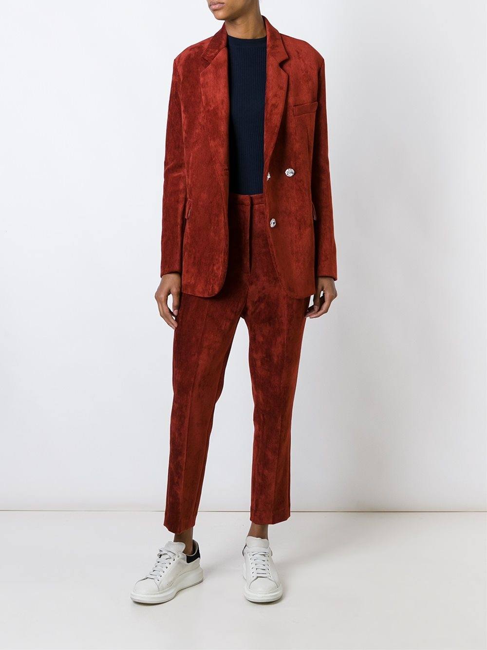 В новом сезоне сочетать костюмы из бархата стилисты рекомендуют со седеющими вещами: