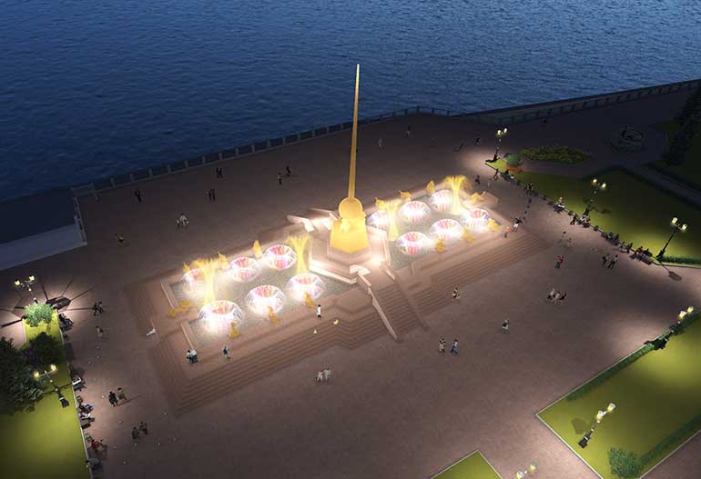 На лестничной террасе, расположенной на берегу Енисея расположена скульптурная группа, символизирующая Сибирские реки. Вода льется прямо по ступеням, на ступенях 8 скульптур. Центральная скульптура символизирует Енисей, сем других танцующих вокруг Енисея – символизируют малые реки Красноярского края. Подробнее здесь.