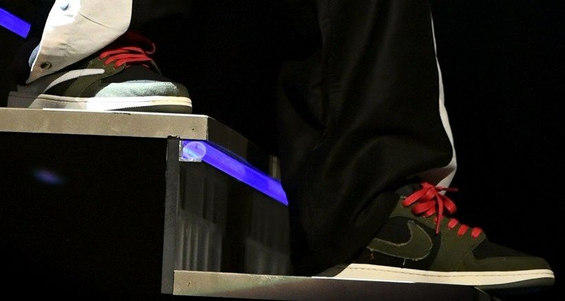 Скотт выступил в черно-зеленых Air Jordan 1 с красными шнурками на церемонии вручения «Грэмми». На внешней стороне присутствуют белые перевернутые свуши, а логотип на внутренней панели по краям усеян бахромой.