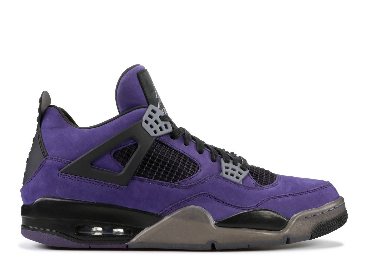 Скотта и его диджея Chase B не раз замечали в фиолетовых AJ 4, однако пара так и не получила официального релиза. Многие эксперты называют эти кроссовки лучшей коллаборацией рэпера. В основу верха положена замша баклажанового оттенка, украшенная явными швами и вставками из пластика.