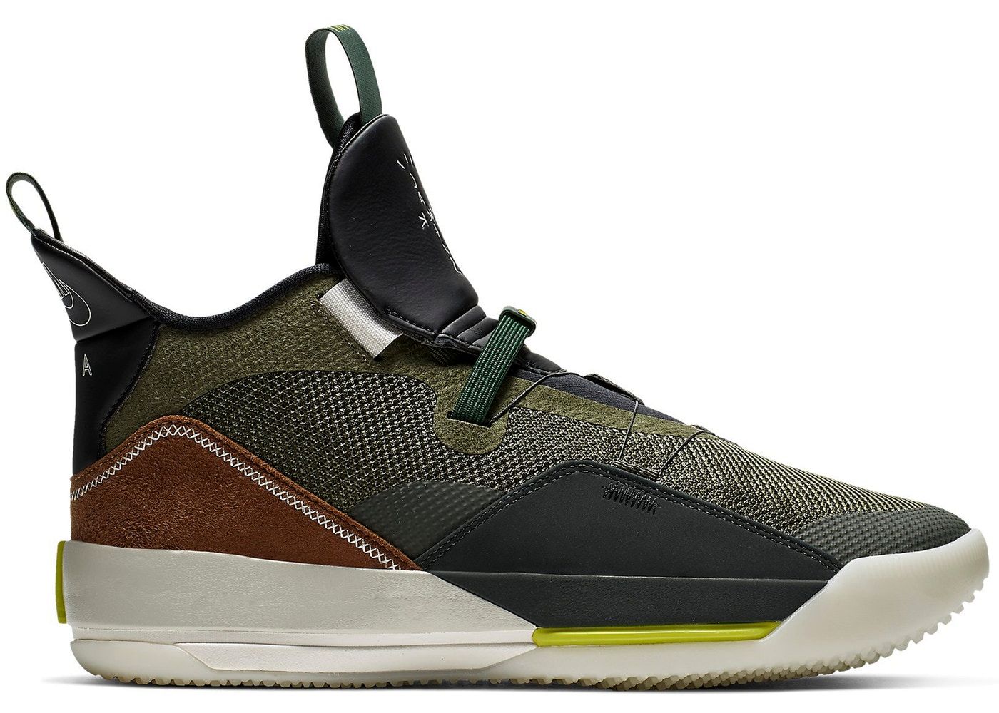 Первые баскетбольные кроссовки Скотта получили оливково-черную расцветку и технологию амортизации Flight Speed. Модель в стиле милитари покрыта броневым нейлоном, оснащена деталью с надписью «PULL TO EJECT» и ярлычком со словами «сделано по точным указаниям Трэвиса» на месте «указаний спортсменов».