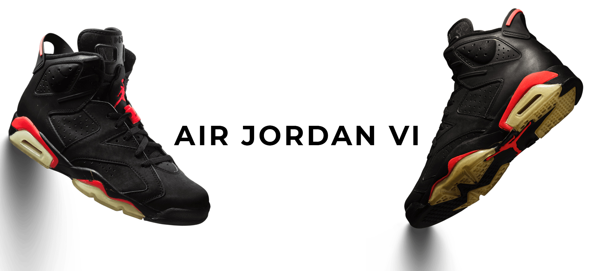 В Air Jordan VI Майкл выиграл свой первый чемпионат НБА вместе с «Чикаго Буллз». Дизайн кроссовок Джордана был вдохновлен его немецким спорткаром. Это были первые баскетбольные кроссовки с усиленным мыском, первая модель бренда с накладкой на заднике, облегчающей надевание. В форме боковых панелей зашифрован игровой номер спортсмена — «23».
