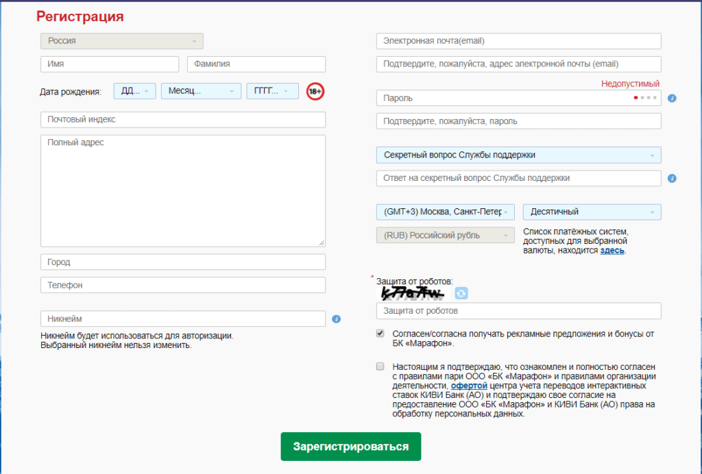 Получить доступ ко всем предложениям букмекерской конторы Marathonbet можно, зарегистрировавшись. Поскольку деятельность букмекера легальна, процесс регистрации проходит в несколько этапов.