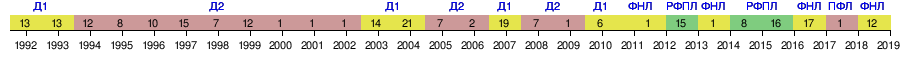 | Вторая лига | 12 | 6 | 13 | 13 | 21-39 | 25 | 1/256 | |
