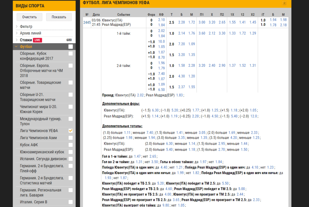 Лучше всего расписаны ставки на футбол. На финальный матч Лиги чемпионов букмекер предлагает огромное количество дополнительных рынков: на автора гола и победу команда, на индивидуальную статистику футболистов и команд.