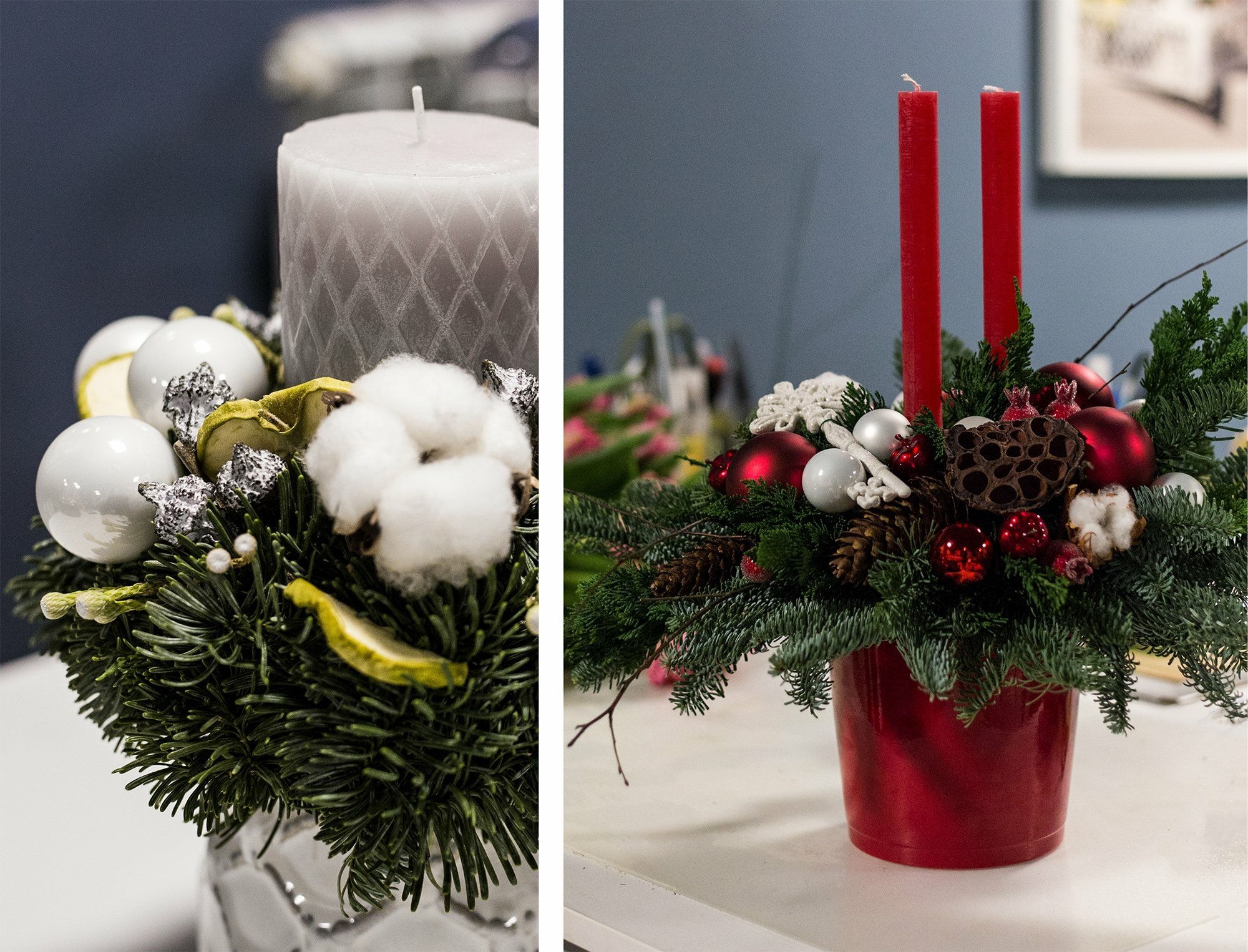 Новогодние букеты можно попробовать сделать своими руками или доверить работу профессионалам из цветочных салонов.