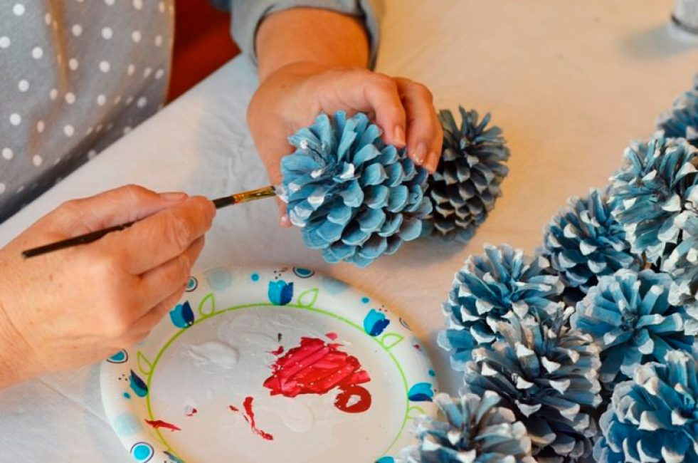 Самый простой вариант покрасить шишки аэрозольной краской. В этом нет ничего сложного — стоит только убедиться в аккуратности и застелить окружающее пространство.