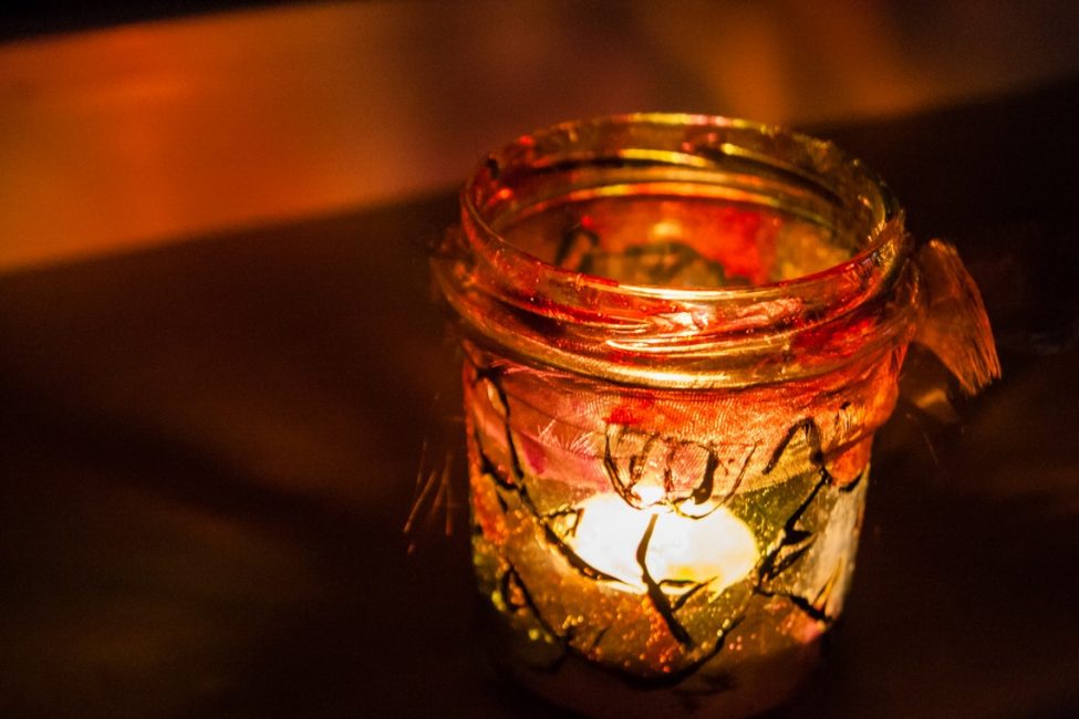 - Украсить основную часть емкости при помощи декупажа, «нарядив» ее в декорированный мешочек из ткани или органзы, либо просто расписать акриловыми красками и блестками. Затем поместить подходящую по диаметру свечу в горлышко. Тая, она будет оплывать красивыми потеками воска, что смотрится великолепно.