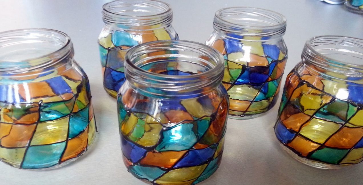 обклеить бокал снаружи растениями, аппликацией из бумаги или фольги