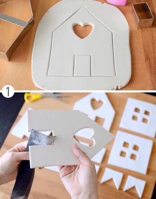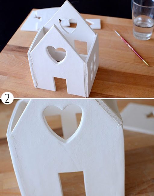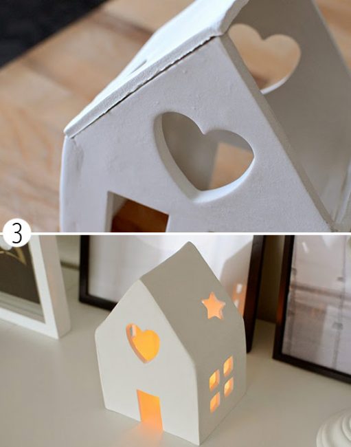 Получившуюся композицию сушим в духовке на очень низкой температуре. Когда работа подсохла, ее можно декорировать любыми красками. Сверху покройте домик лаком. Поставьте внутри него небольшую свечу, и он будет светиться мягким светом, а из трубы будет тихонько выходить настоящий дым!