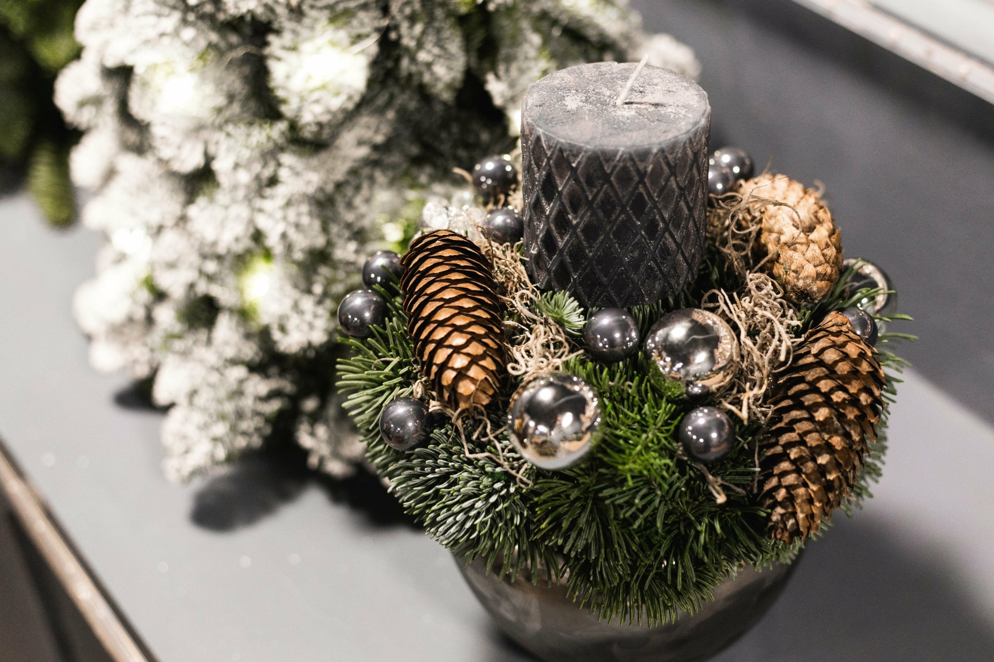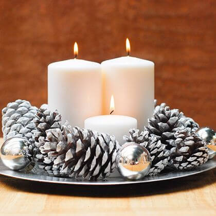 На блюдо поставьте большую свечу, а вокруг разложите шишки.