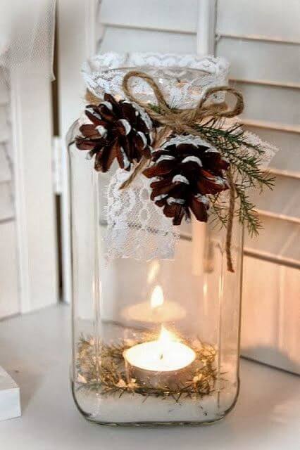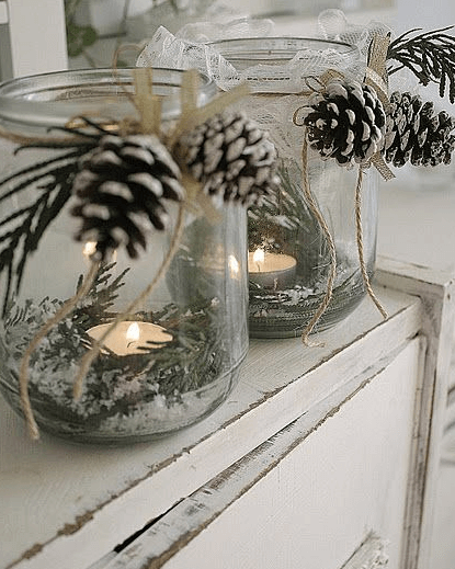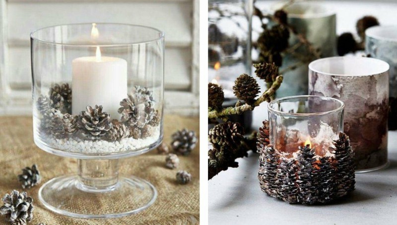 Подсвечник из шишек на новый год можно сделать в стеклянных банках. Для этого подойдут маленькие свечи, а также пригодятся еловые ветки и ленточки. Добавьте искусственного снега для более реальной картины.