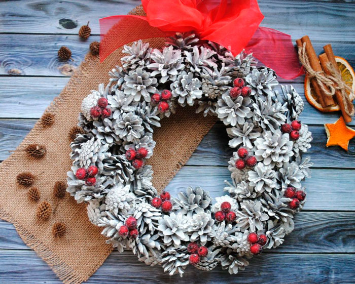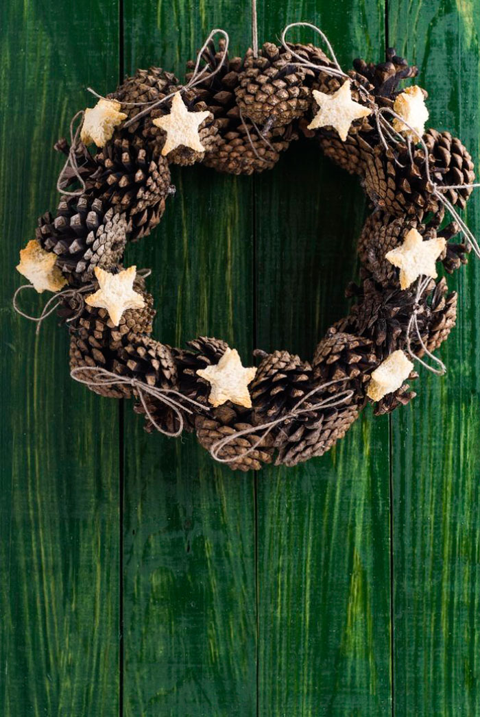В последнее время стало модным вешать рождественские венки из шишек на двери.