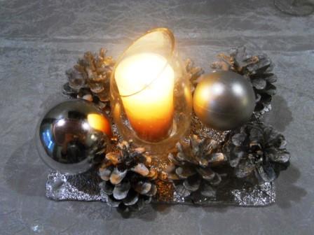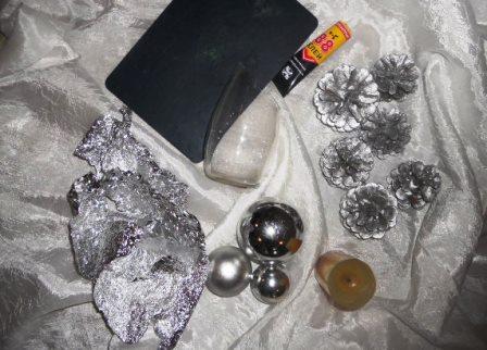 В середине нашей доски с фольгой устанавливаем подставку под свечу. Вокруг раскладываем шишки, веточки, игрушки. Когда получившаяся композиция приобретет привлекательный вид, начинаем приклеивать предметы.