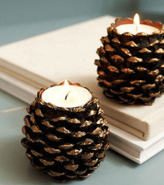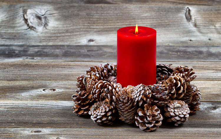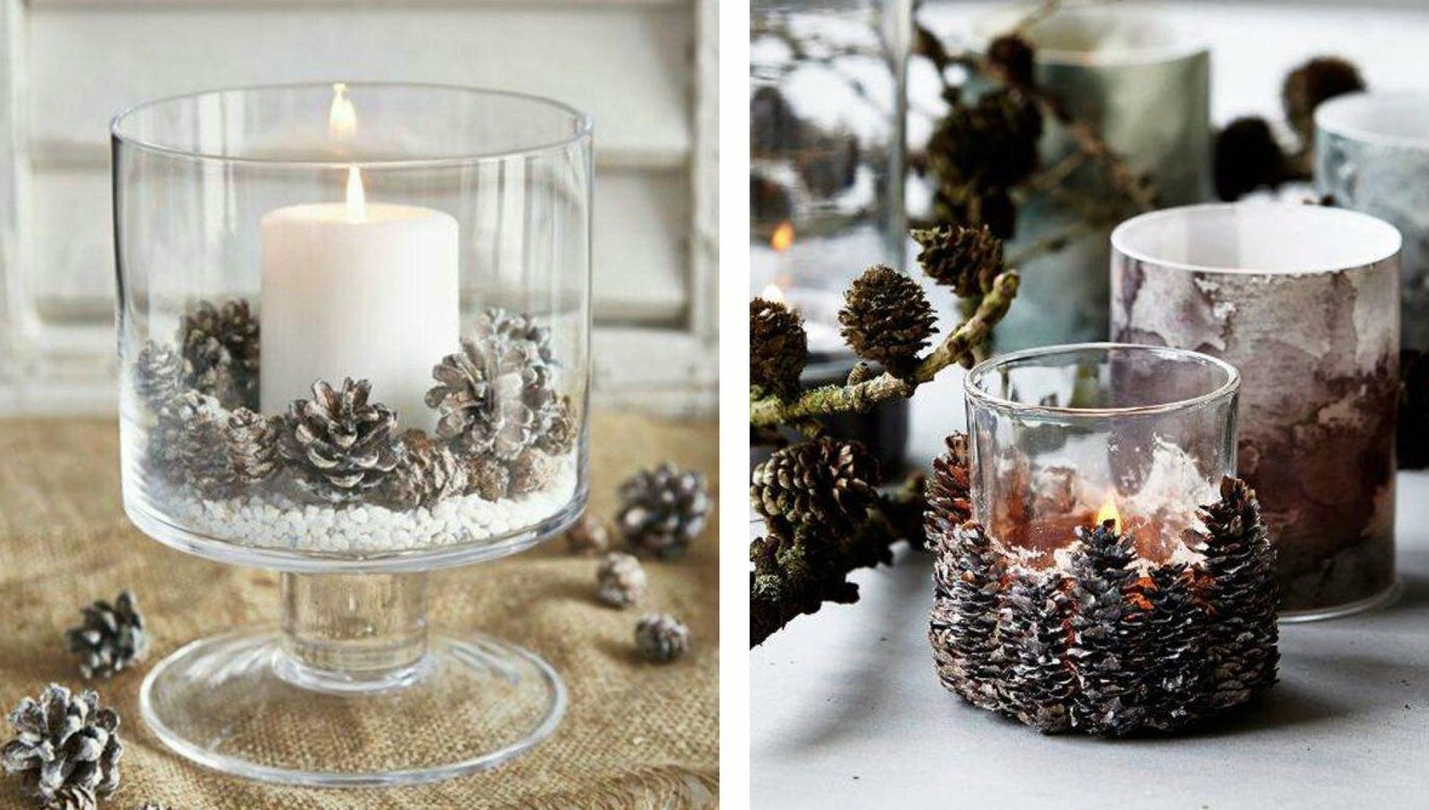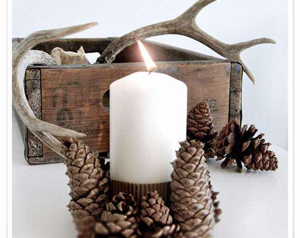 Новогодние праздники сложно представить без уютной атмосферы, которую дополнительно помогут создать для вас свечи. В качестве красивой оправы для свечи можно сделать рождественский венок из шишек. Вариантов на эту тему существует не мало и все они будут зависеть от вашей фантазии. Можно сочетать шишки с еловыми ветками, искусственными ягодами и ветками дерева. А можно просто собрать красивые шишки и склеить их меду собой по кругу, а внутрь вставить стакан со свечей.