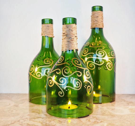 - Второй вариант куда более сложный, так как он подразумевает удаление донышка бутылки. Для этого можно воспользоваться стеклорезом или пропитанным горючим составом шпагатом. Обмотайте его вокруг бутылки и подожгите. Когда емкость достаточно прогреется, резко опустите ее в холодную воду, и донышко легко отделится от основной части. После этого, как и в случае с бокалом, вырежьте по диаметру емкости круг из картона, поставьте на него свечу и зажгите ее. Накройте сверху бутылкой, как колпаком, горлышко не затыкайте. Подсвечник готов! Украсить его можно росписью или бумажным абажуром с фигурными прорезями.