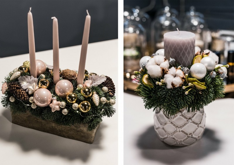 Композиции из настоящих еловых веток, шишек и сухоцветов создаются на основе вазы или горшка, внутрь которого кладется специальный материал пиафлор. Из-за его антибактериальных свойств растения меньше подвержены гниению. Пиафлор или флористическая губка удерживает влагу и надолго сохраняет букетам первозданную свежесть. Пока еловые ветки свежие, им можно придать нужную форму и закрепить проволокой. Игрушки и другие декоративные элементы крепятся на клей.