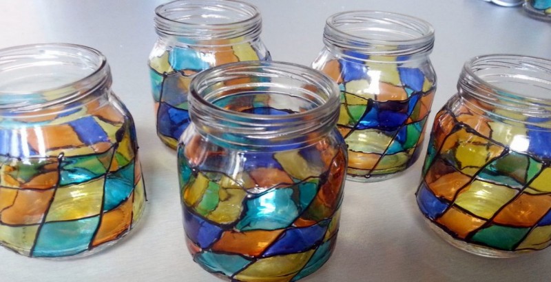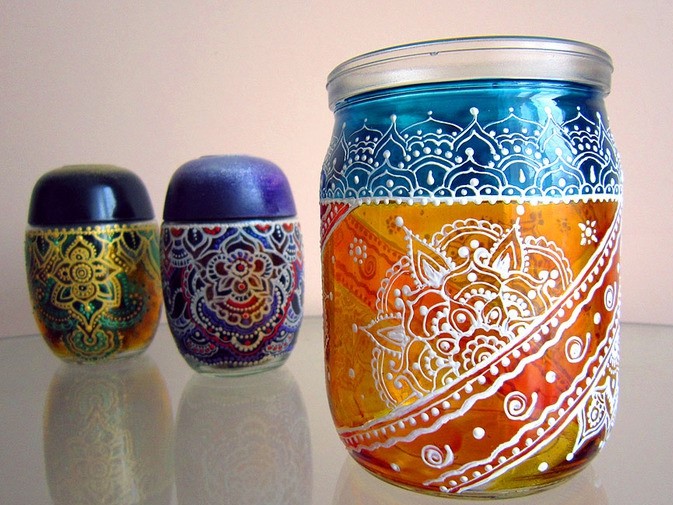- Украсить основную часть емкости при помощи декупажа, «нарядив» ее в декорированный мешочек из ткани или органзы, либо просто расписать акриловыми красками и блестками. Затем поместить подходящую по диаметру свечу в горлышко. Тая, она будет оплывать красивыми потеками воска, что смотрится великолепно.