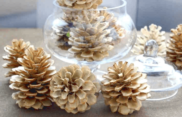 Самый простой вариант покрасить шишки аэрозольной краской. В этом нет ничего сложного — стоит только убедиться в аккуратности и застелить окружающее пространство.