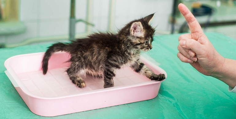 Если котенок начинает беспокоиться и «искать место», то требуется отнести его и посадить в лоток.