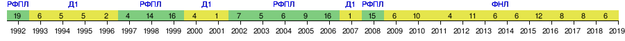 | Высшая лига 9—20 места | 22 | 3 | 5 | 14 | 19-34 | 11 | Вылет в первую лигу | |||