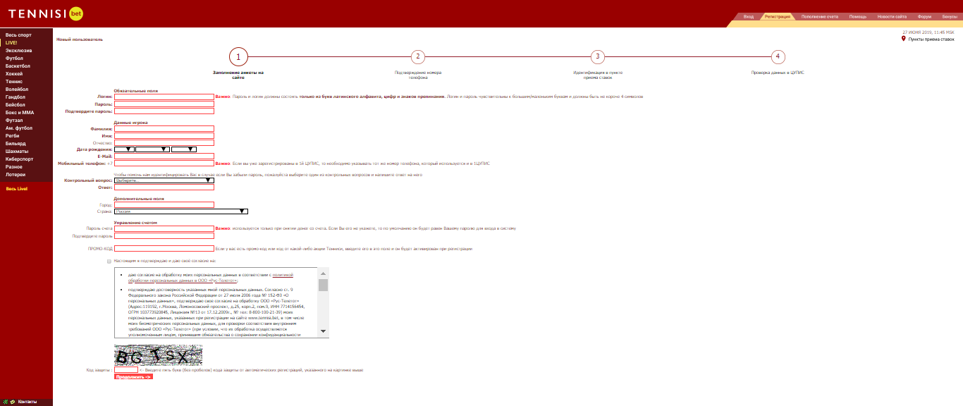 В форме регистрации необходимо указывать только свои реальные данные и заполнять их без ошибок! В противном случае вы не сможете пройти идентификацию личности и делать ставки.