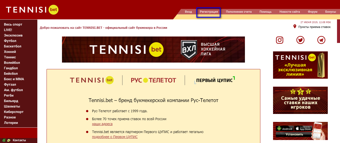 Создать новый аккаунт можно самостоятельно на официальном сайте tennisi.bet или в одном из офисов букмекера.