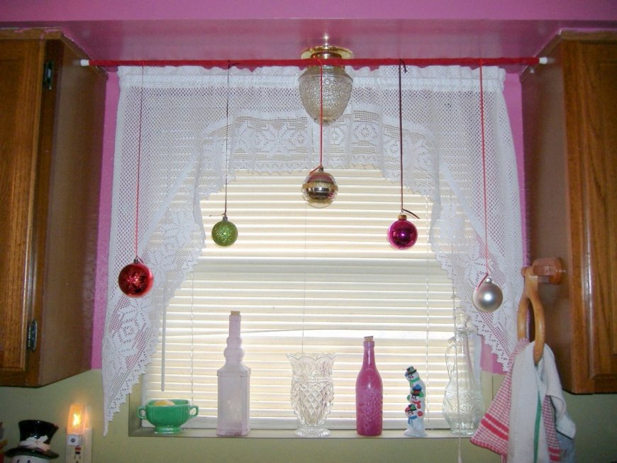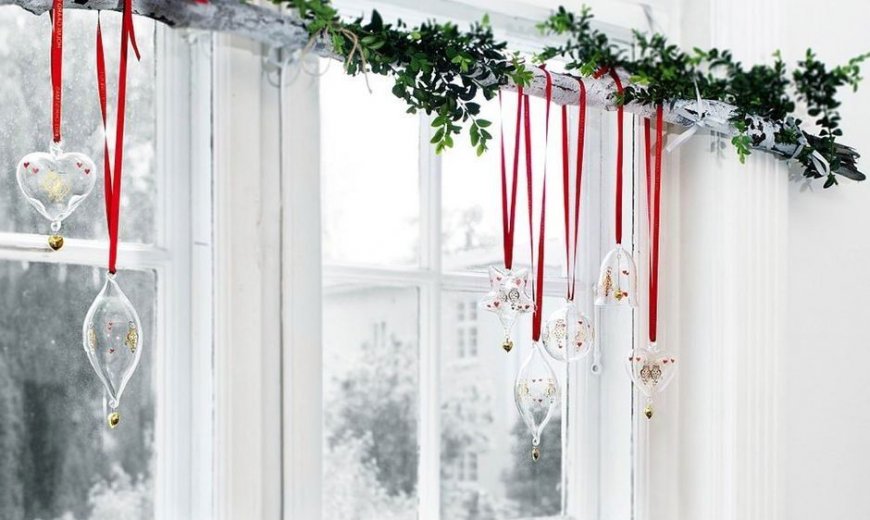 Детей порадует веселое украшение окна пушистыми помпончиками, для этого потребуются разноцветные помпончики, желательно миниатюрных размеров, игла и крепкие нитки. Создание данного декора происходит следующим образом: с помощью иголки на длинную нитку фиксируются помпончики, в конечном итоге должна получиться пушистая, разноцветная гирлянда. Затем с помощью скотча пушистая гирлянда закрепляется на карнизе окошка.