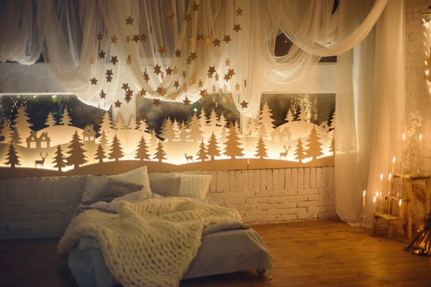 Лучшее украшение спальни – свечки чистых, холодных оттенков. Придать помещению праздничное настроение можно, разместив свечи на искусственных елочных ветках на подоконниках или свободных полках. Окно в комнате отдыха рекомендуется украсить серебристой мишурой или огоньками. Если хотите получить незабываемую новогоднюю атмосферу, выбирайте гирлянды со светящимися звездами или крупными тканевыми шарами.
