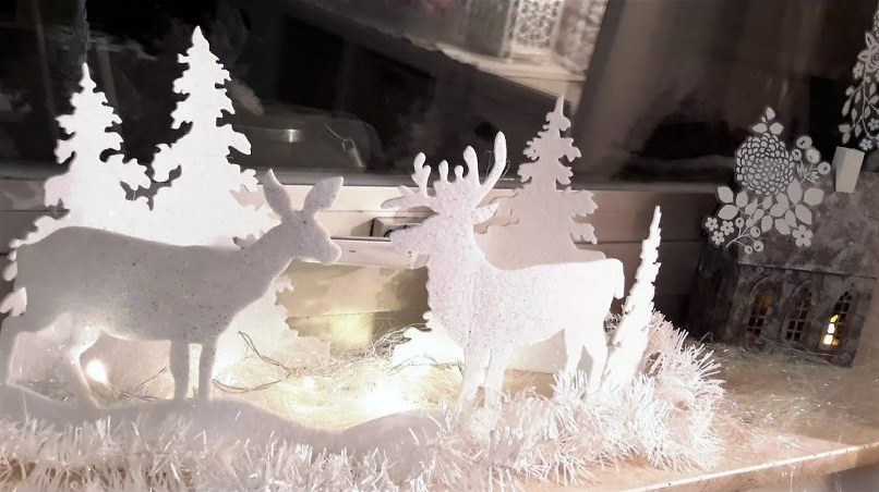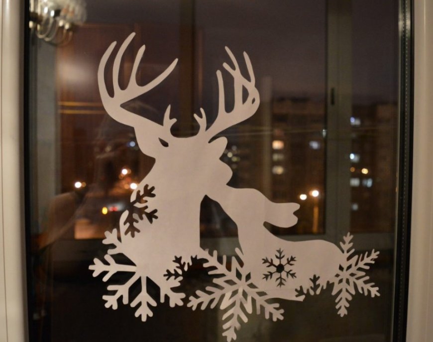 Таким способом украшаются окна на новый год трафареты, для которого можно изготовить самостоятельно. Дополнить рисунок можно узорами, сделанным зубной пастой или искусственным снежком. Отлично впишутся в данную композицию резные снежинки, наклеенные на стеклянную поверхность окна.