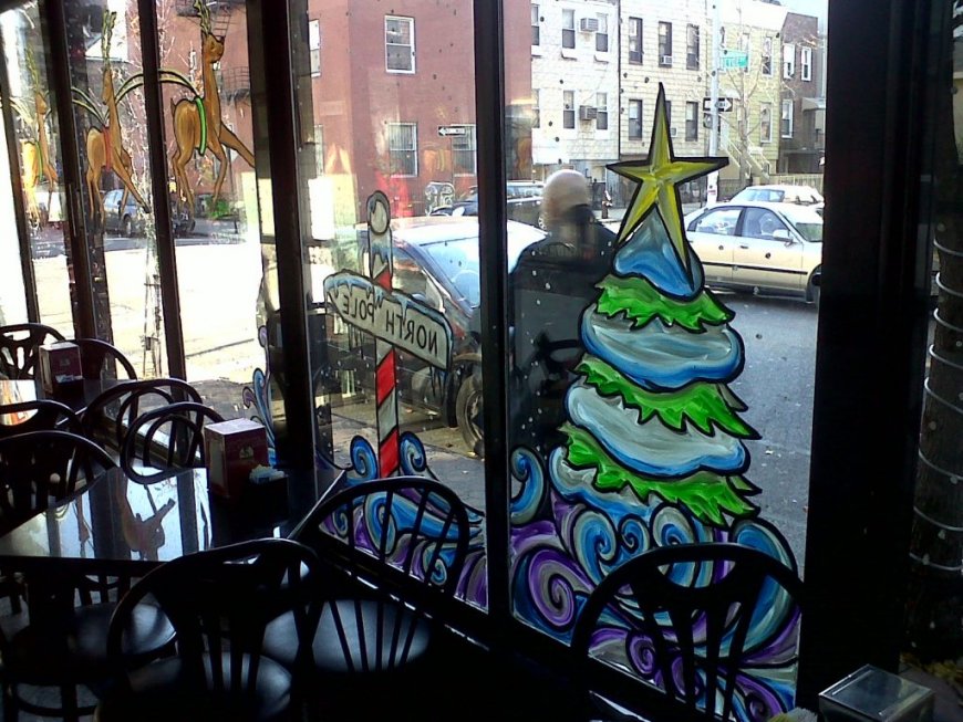 Отличным вариантом декора является роспись стекол гуашью, благодаря которой можно создать самую настоящую новогоднюю картину из зимних узоров.