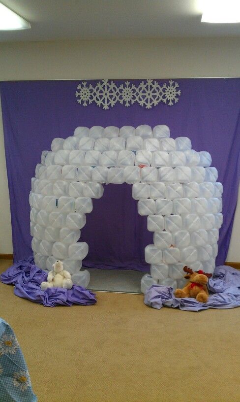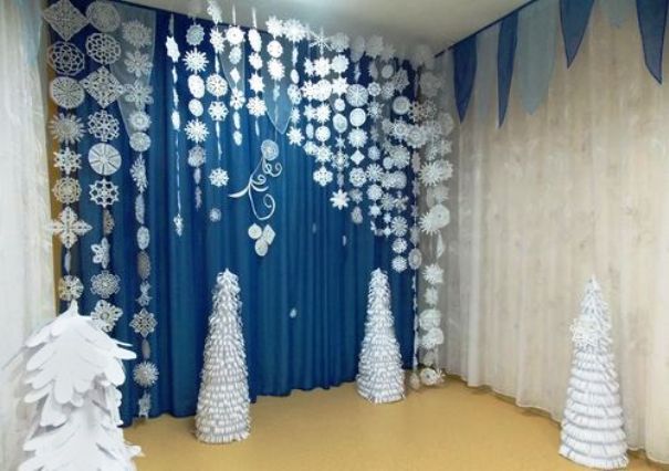 Декорации из бумаги в белом цвете удачно передают атмосферу зимы.