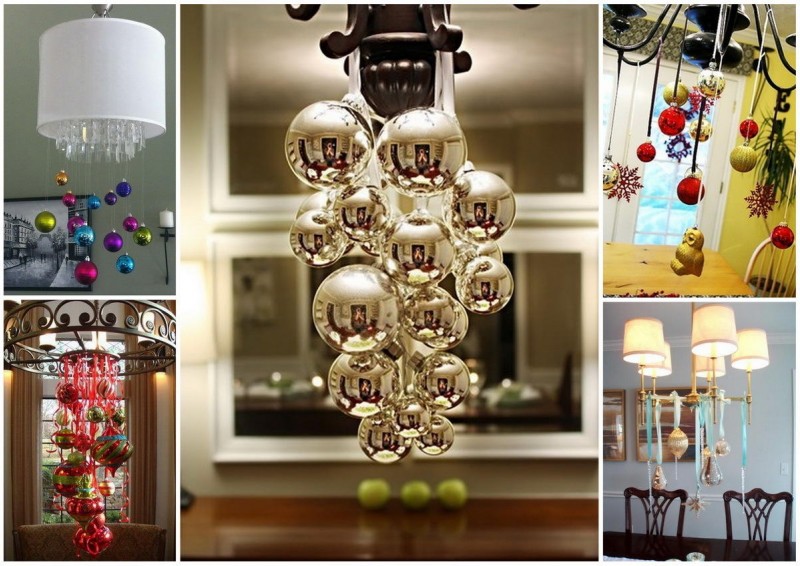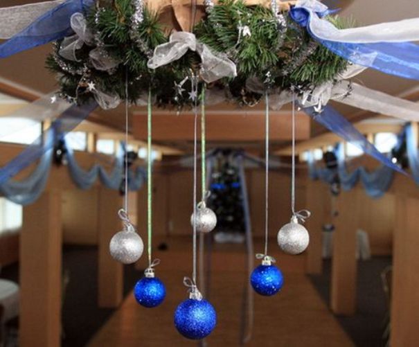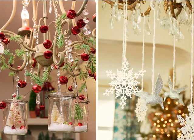 Также можно украсить потолок помещения, развесив рядом с люстрой красивые подвески из елочных шаров, стилизованные подсвечники из фигурных стеклянных банок и елочные венки. Красиво на большой люстре, висящей над праздничным столом, будут смотреться подвески из ажурных снежинок.