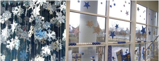 В коридорах обычно оформляют стены, окна и потолок, потому что декорации не должны мешать проходу учеников в классы. Можно устроить обилие снежинок под потолком и бумажные украшения окон.